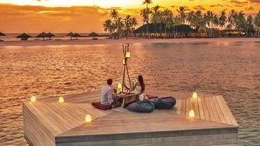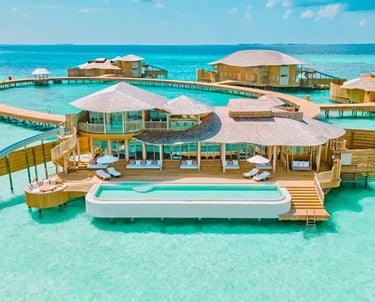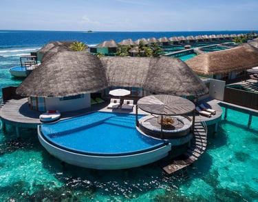 Perched above crystalline lagoons, these iconic sanctuaries blur the line between sea and sky. Wake to gentle waves beneath your floor, descend your private ladder into turquoise depths, and surrender to the rhythm of the ocean. Glass floor panels reveal marine life below; sunset decks invite uninterrupted horizon gazing. For couples seeking the Maldives’ most romantic address.