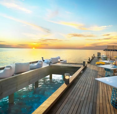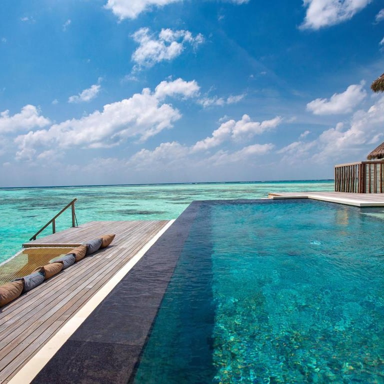 Soneva Jani is a luxury resort on Medhufaru Island in the Noonu Atoll, Maldives, known for its overwater villas and sustainable luxury. Accommodation: The resort offers 58 overwater and island villas with pool terraces, ocean views, retractable roofs for stargazing, and waterslides into the lagoon. Dining: Includes The Gathering (diverse cuisines), The Crab Shack (romantic crab dishes), and So Starstruck (stargazing dining). Activities: Features PADI-certified diving, water sports, The Den (kids’ zone), and Soneva Spa with natural treatments, a gym, and yoga pavilion. Sustainability: Operates Eco Centro for waste reduction and applies a 2% carbon levy to offset emissions. Access: Accessible via a scenic seaplane flight from Malé International Airport.